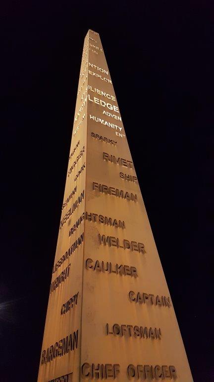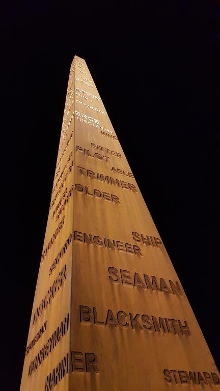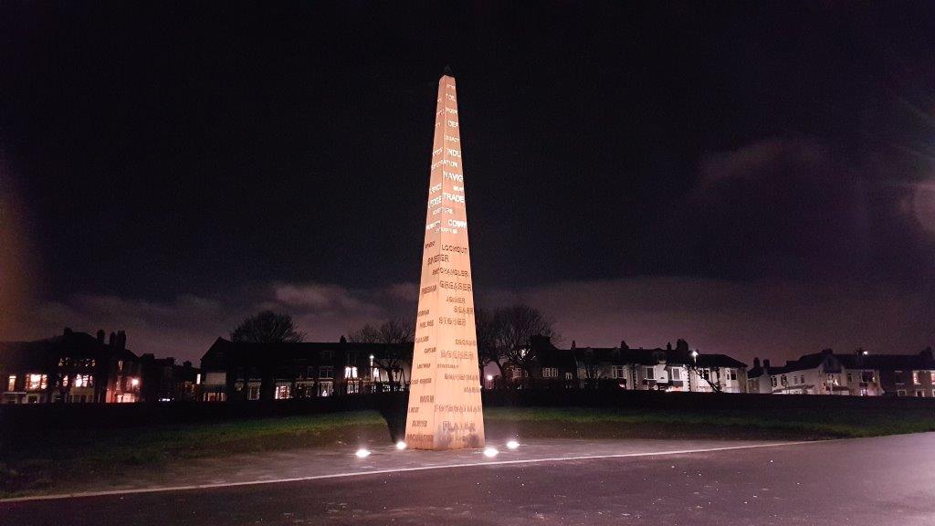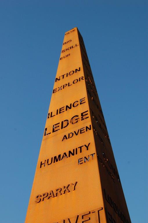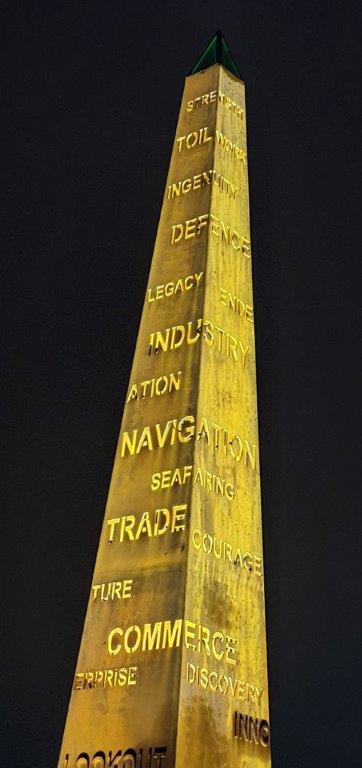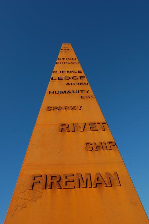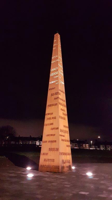 ‘Shipping Beacon’ is 6 metre tall and if features cut out and internally lit evocative words such as Navigation, Exploration, Industry, Resilience and below this trade/occupation names have been cut from 5mm Core Ten steel sheet and welded on and lit externally. Names such as Bosun, Stoker, Greaser and Foyboatman stimulate conversation about local people and provide identity and a source of pride and belonging.